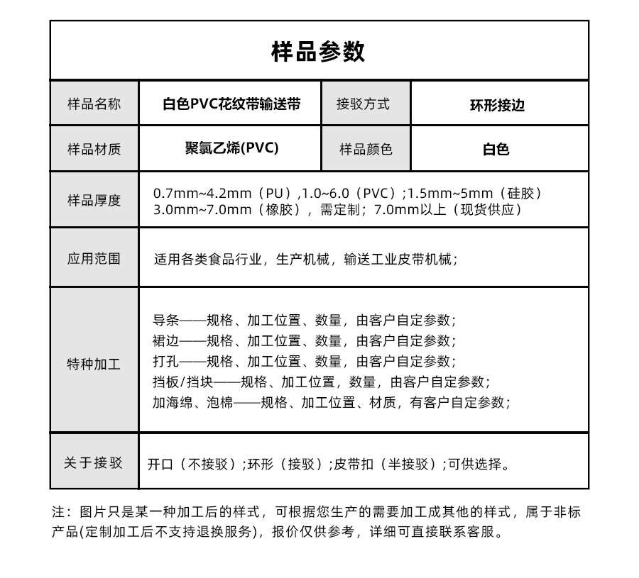| 樣品名稱 | 白色PVC花紋帶輸送帶 | 接駁方式 | 環形接邊 |