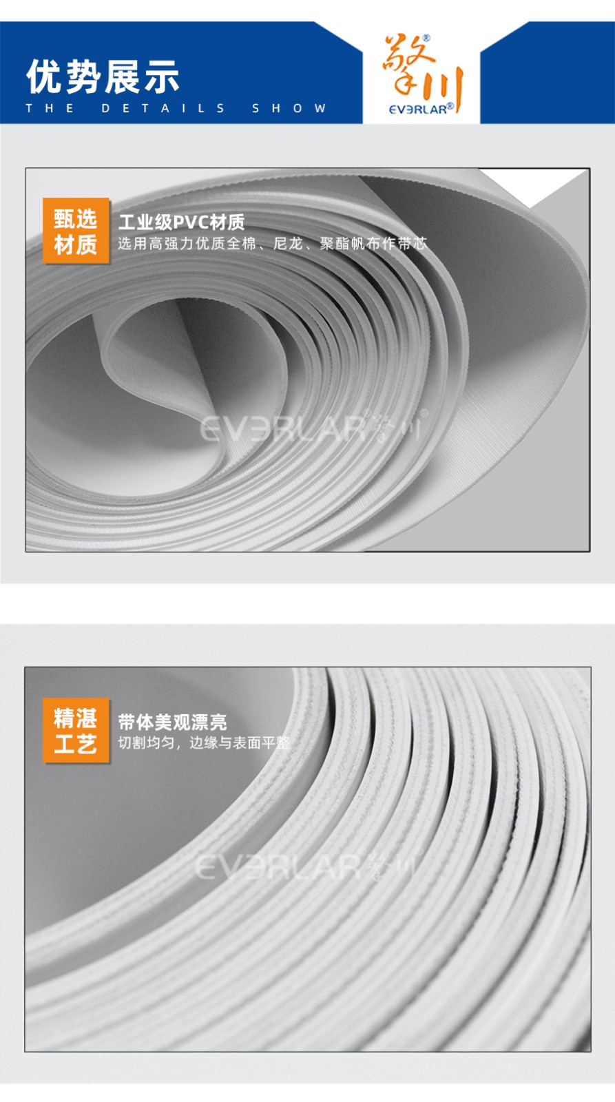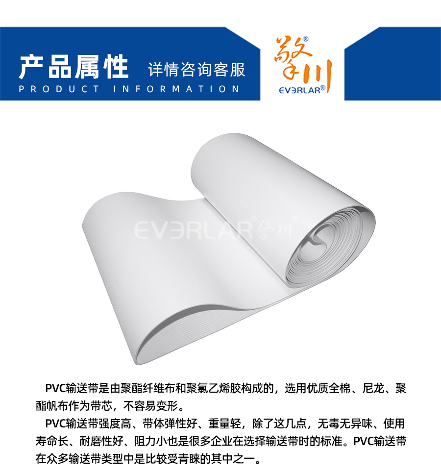 PVC輸送帶強度高、帶體彈性好、重量輕,除了這幾點,無毒無異味、使用壽命長、耐磨性好、阻力小也是很多企業在選擇輸送帶時的標準。PVC輸送帶在眾多輸送帶類型中是比較受青睞的其中之一。