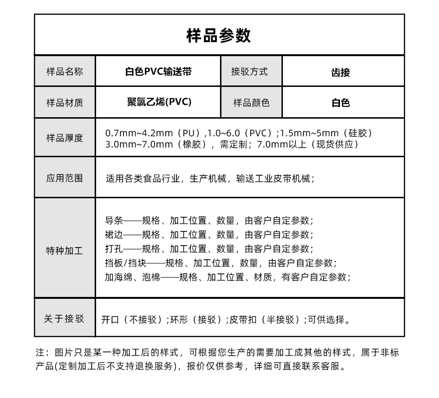 | 樣品名稱 | 白色PVC輸送帶 | 接駁方式 | 齒接環帶 |