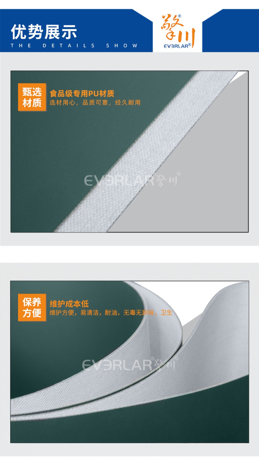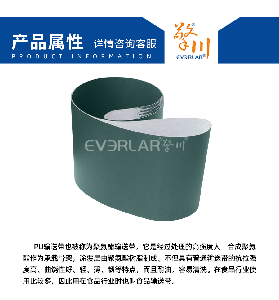 • 產品名稱:everlar擎川定制墨綠色PU輸送帶食品包裝輸送皮帶