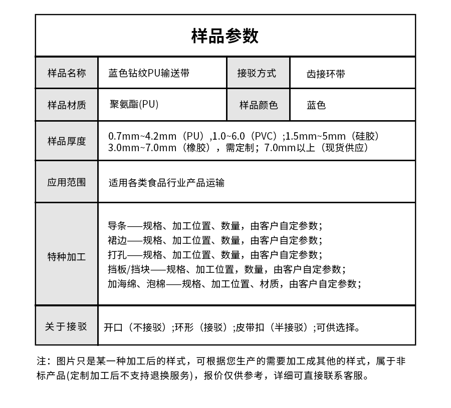 • 產品名稱:擎川everlar定制藍色鉆紋PU輸送帶食品輸送帶