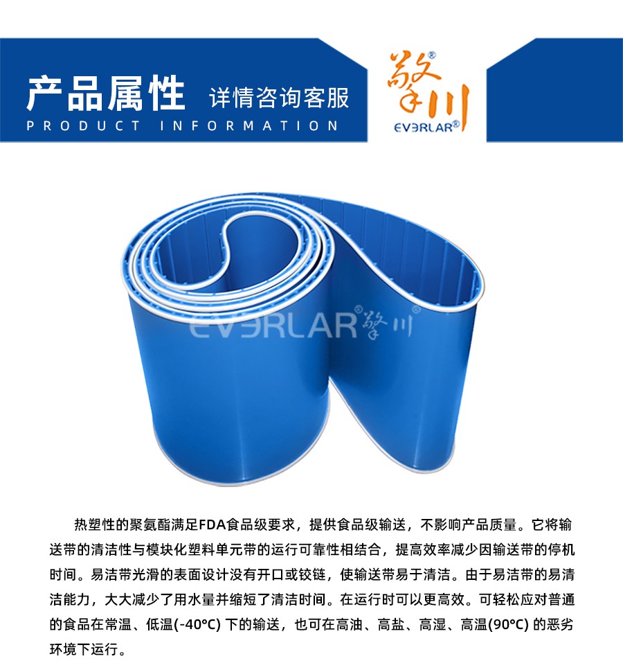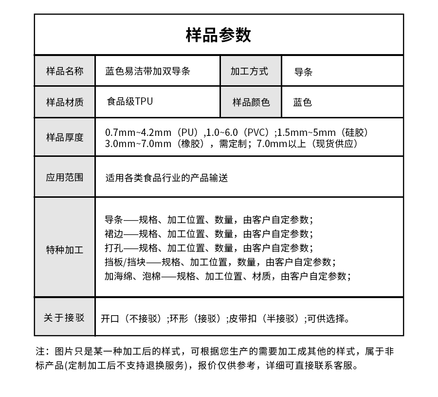 • 產品名稱:藍色易清潔帶加雙導條肉類機械設備皮帶