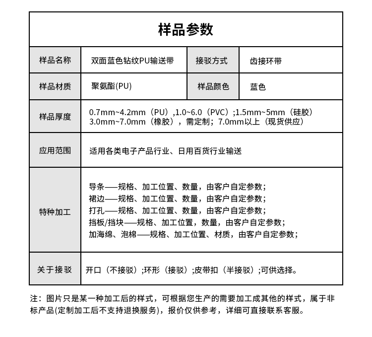 • 產(chǎn)品名稱:雙面藍色鉆紋PU輸送帶耐磨耐油食品級工業(yè)皮帶定制