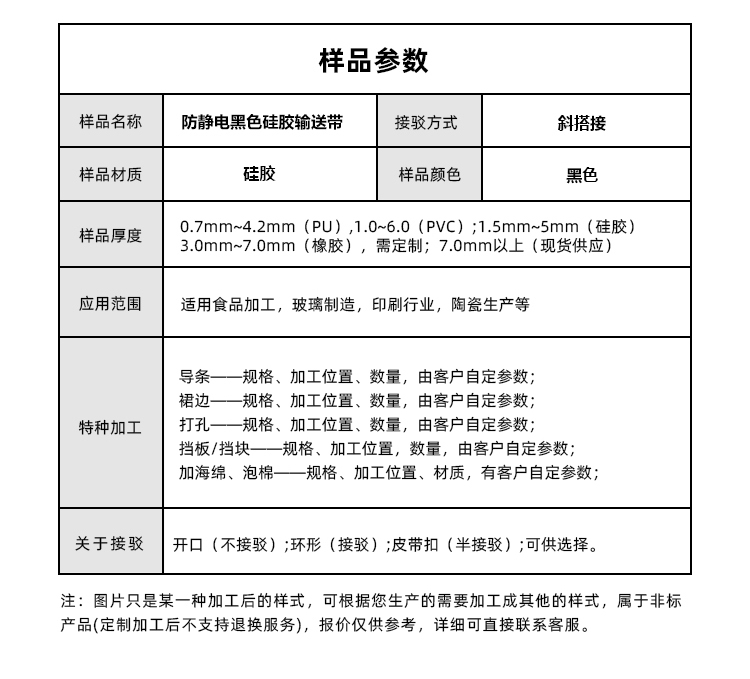 • 產品名稱:防靜電黑色硅膠輸送帶防粘耐高溫防靜電工業皮帶