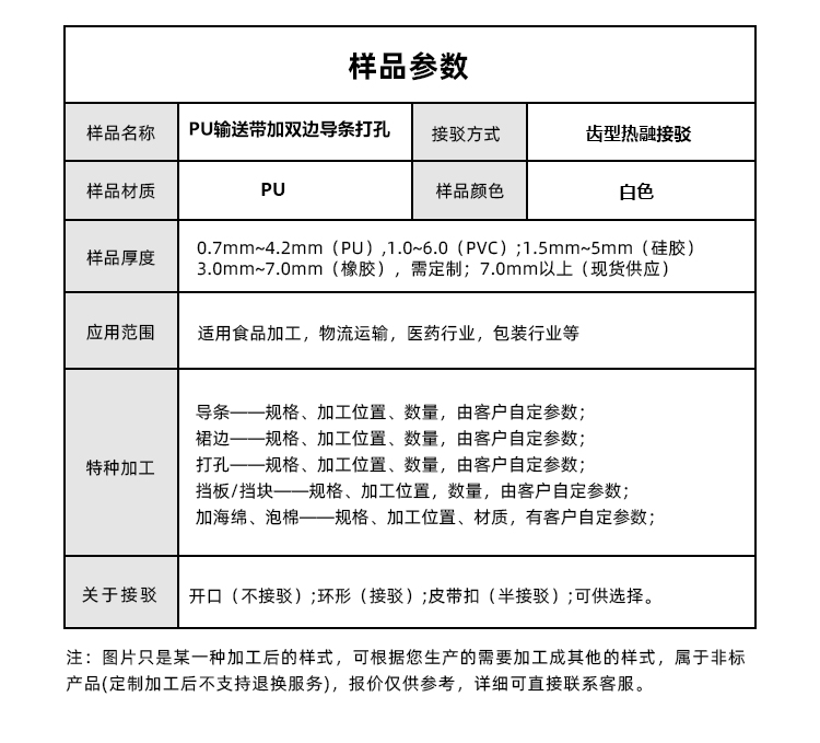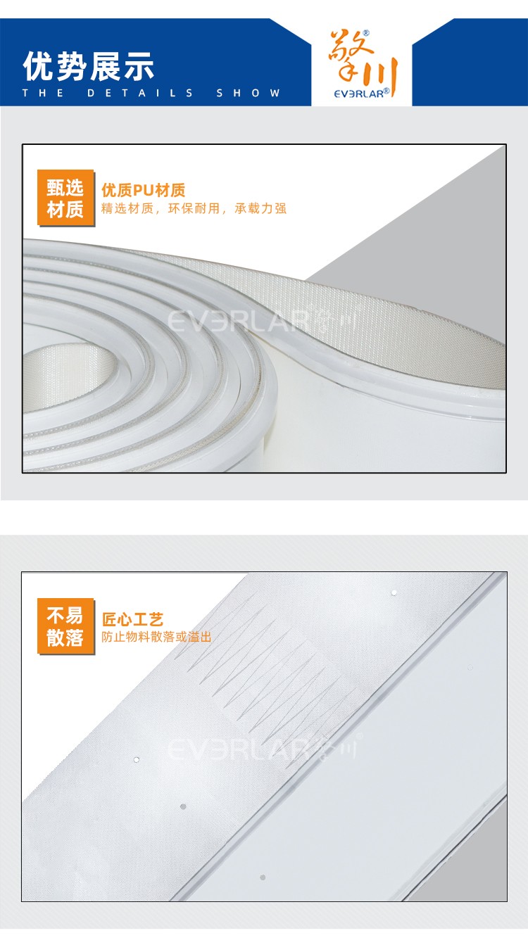• 產品名稱:白色PU輸送帶加雙邊導條打孔耐磨耐油抗拉力強工業皮帶
