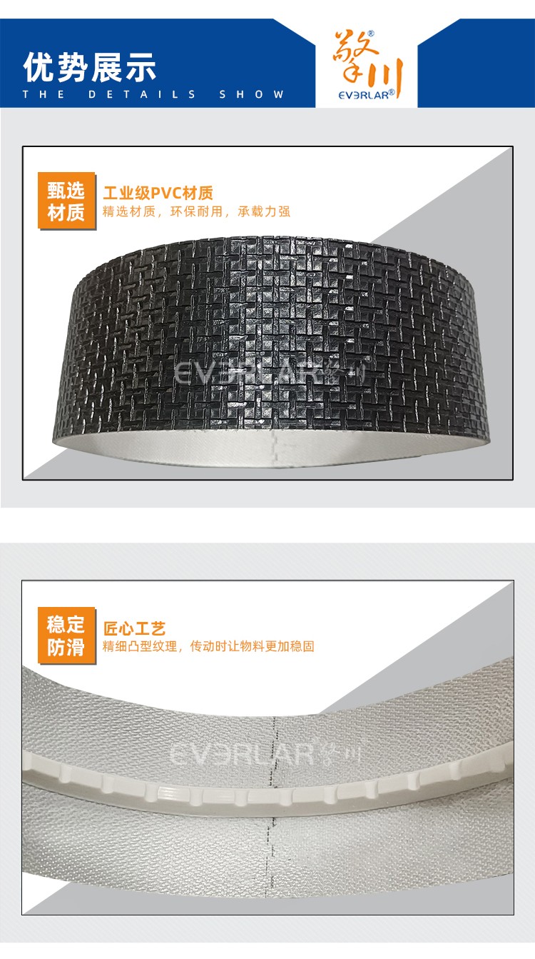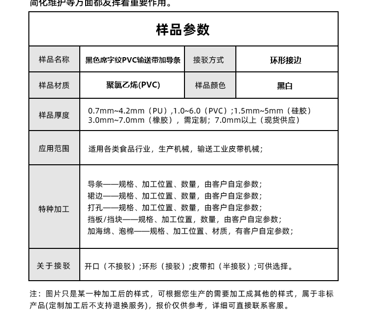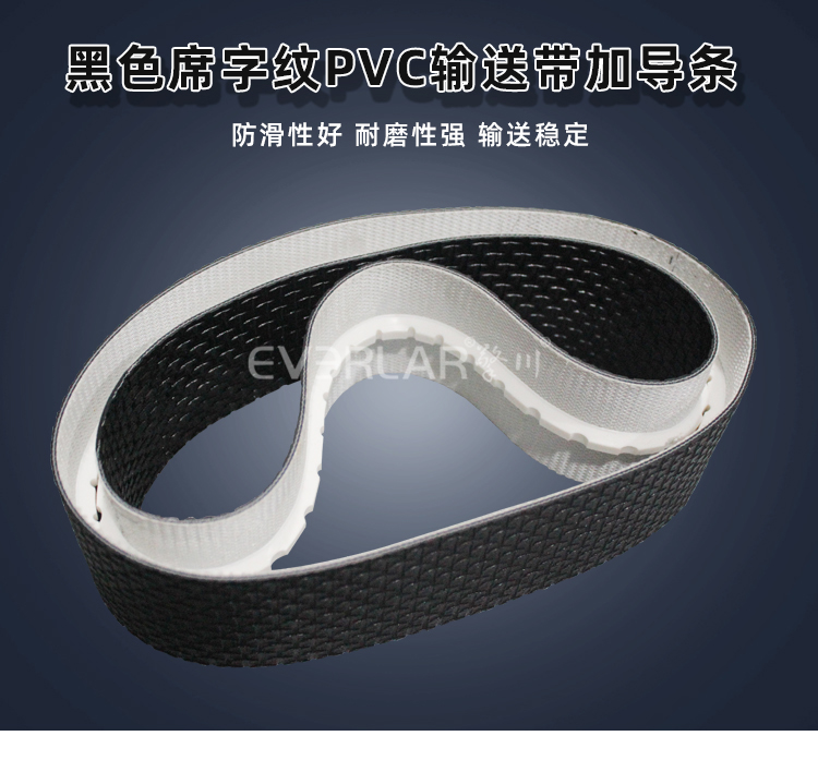 • 產品名稱:黑色席字紋PVC輸送帶加導條耐磨防靜電耐腐蝕工業皮帶