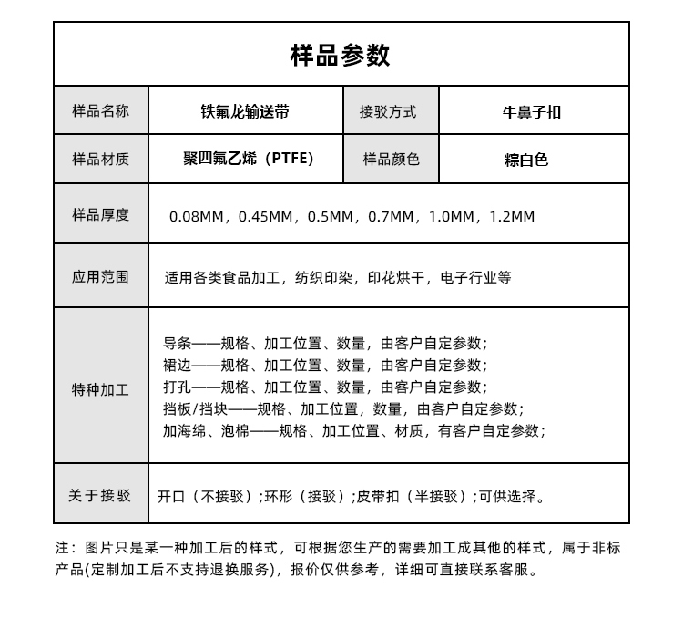 • 產品名稱:鐵氟龍輸送帶耐磨耐腐蝕耐高溫工業皮帶定制