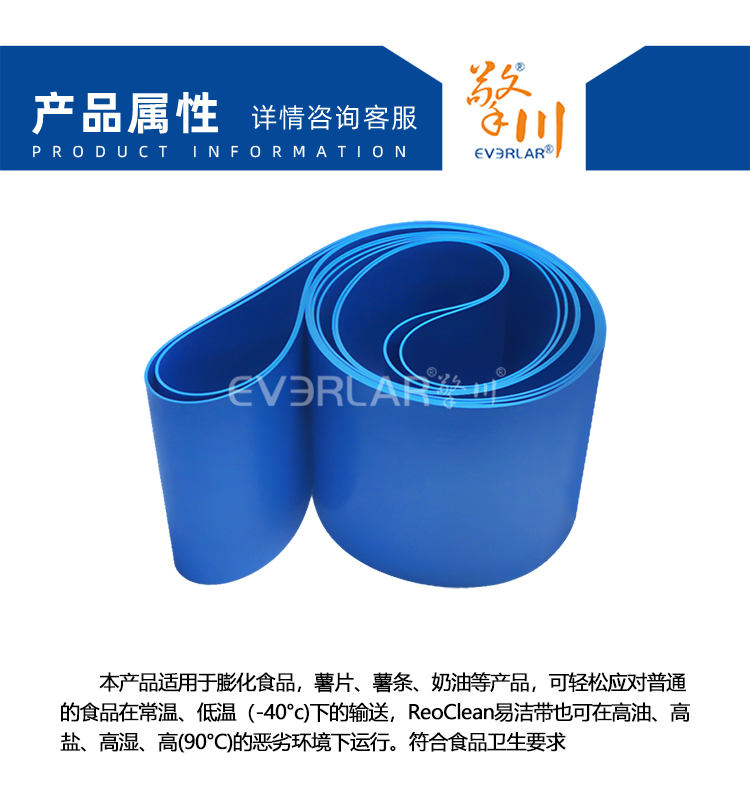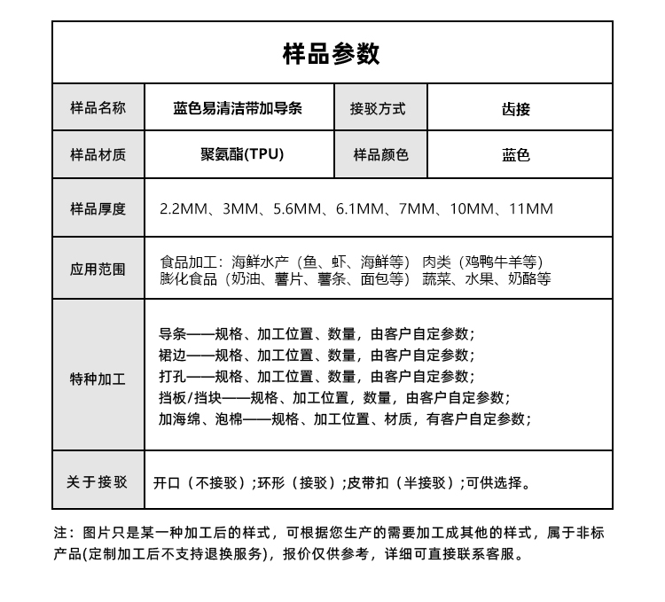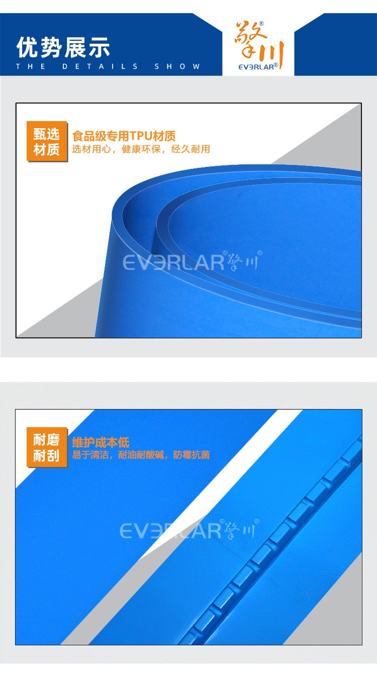 • 產品名稱:易清潔TPU輸送帶加導條精準定位藍色食品級傳送帶廠家定制