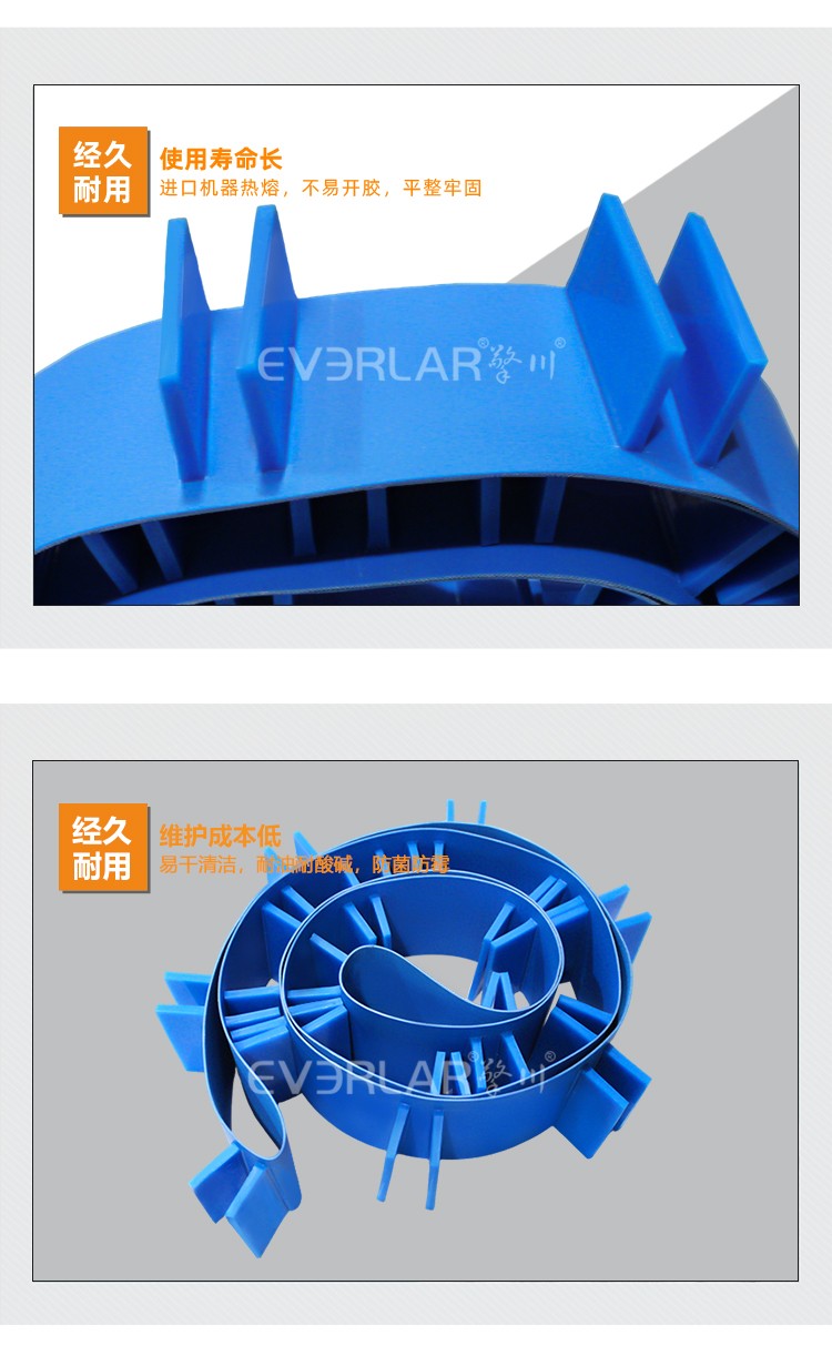 • 產品名稱:藍色PU輸送帶加擋板耐腐蝕食品級海鮮分揀機專配傳輸帶廠家定制
