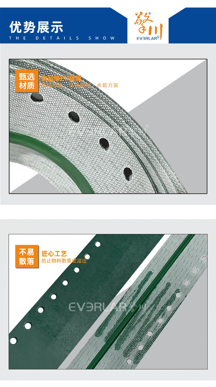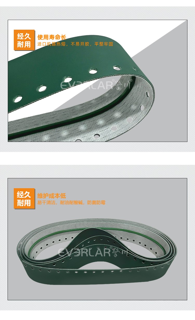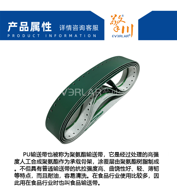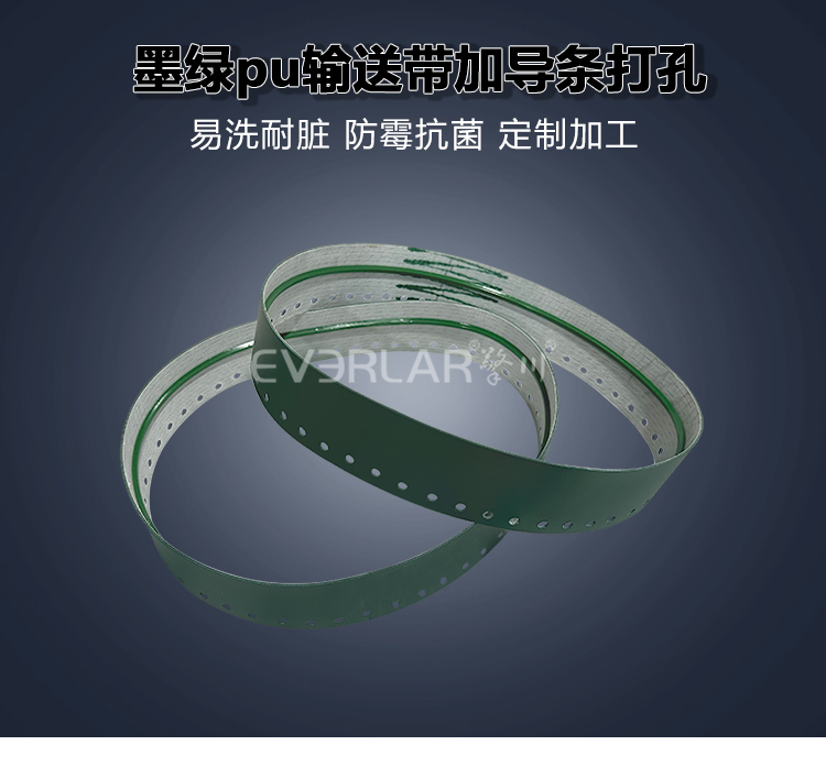 • 產品名稱:墨綠PU輸送帶加導條打孔耐磨抗腐蝕食品級包裝封口機工業皮帶定制