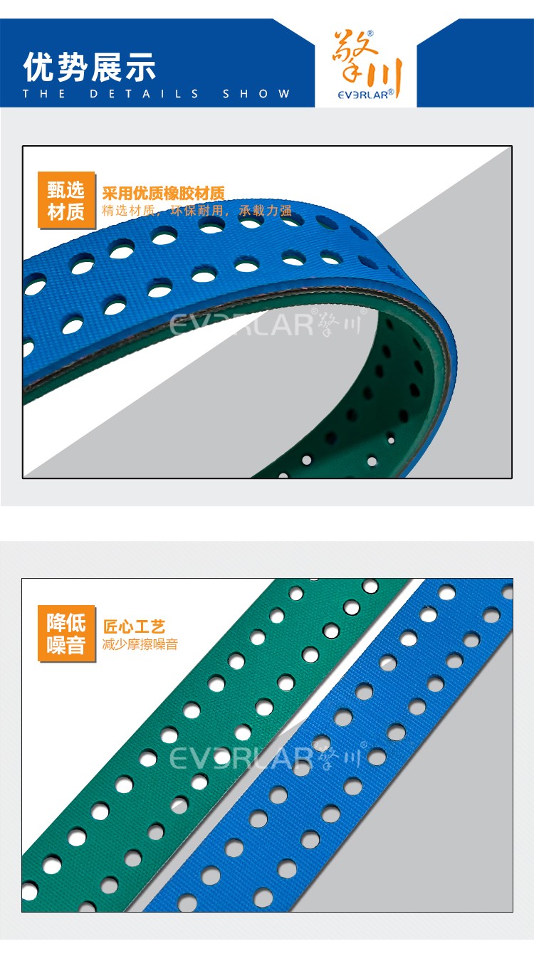 • 藍綠片基帶打孔耐磨防滑物流包裝行業分揀倉儲傳動平皮帶擎川定制
