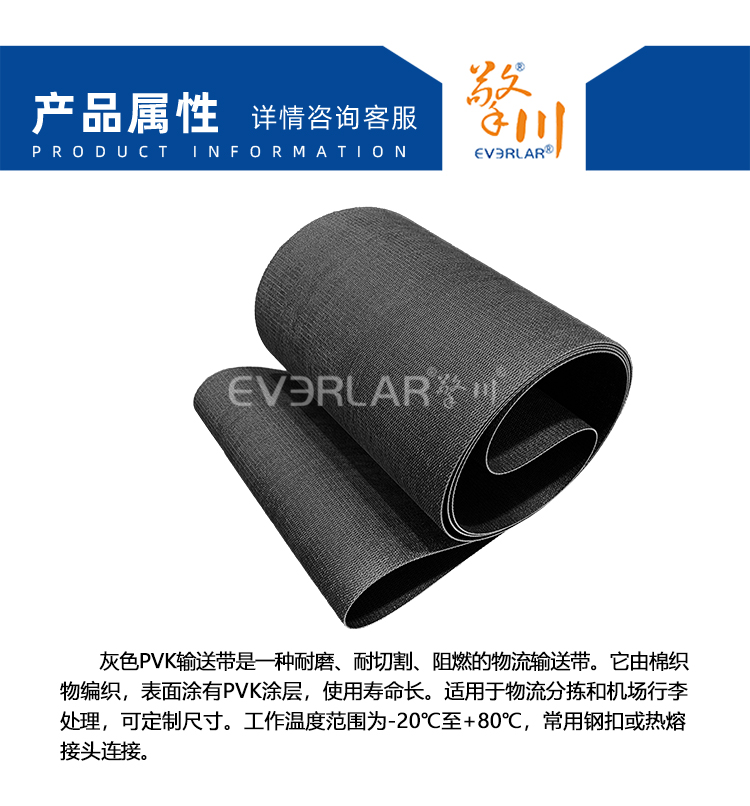 • 產(chǎn)品名稱:灰色PVK輸送帶耐磨抗撕裂物流分揀輸送機專用工業(yè)皮帶廠家定制