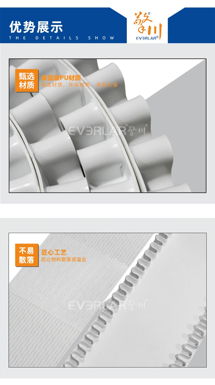 • 產品名稱:白色PU輸送帶加裙邊食品級耐油食品醫藥分揀輸送機皮帶廠家定制